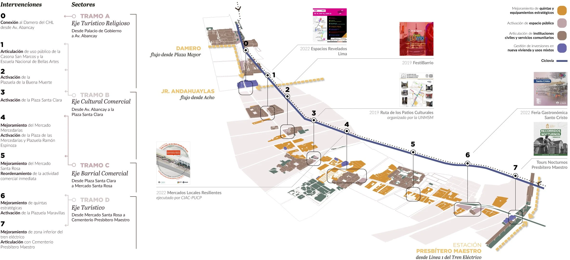 El objetivo es la revitalización económica del eje a través del fortalecimiento del comercio local sensible a las distintas vocaciones de la calle por tramo, y la reestructuración del sistema productivo y cuidado barrial, bajo un enfoque inclusivo y sostenible. Para ello, el mejoramiento físico espacial busca consolidar los servicios y espacios comunes como nodos atractores del barrio; posteriormente, la activación del espacio público y frentes colindantes del eje estructurante aseguran la accesibilidad y habitabilidad de la calle; finalmente, la articulación de las instituciones e iniciativas locales dentro del recorrido cultural-turístico procuran la continuidad y sostenibilidad del nuevo flujo de público, tras la gestión y recuperación del tejido urbano barrial mediante el empoderamiento del residente.